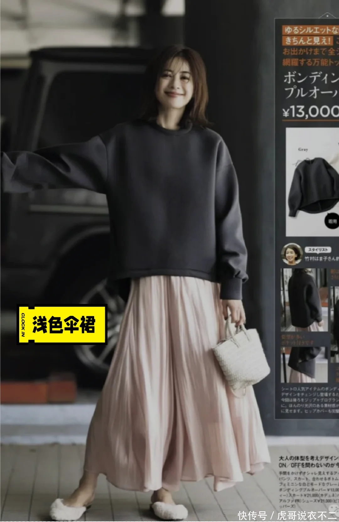 搭配建议:可以选择纯色圆领卫衣,搭配一条基础色的半身裙或休闲裤,整体搭配减龄又舒适。如果选择搭配半身裙,可以选择颜色与卫衣撞色,打造层次感。